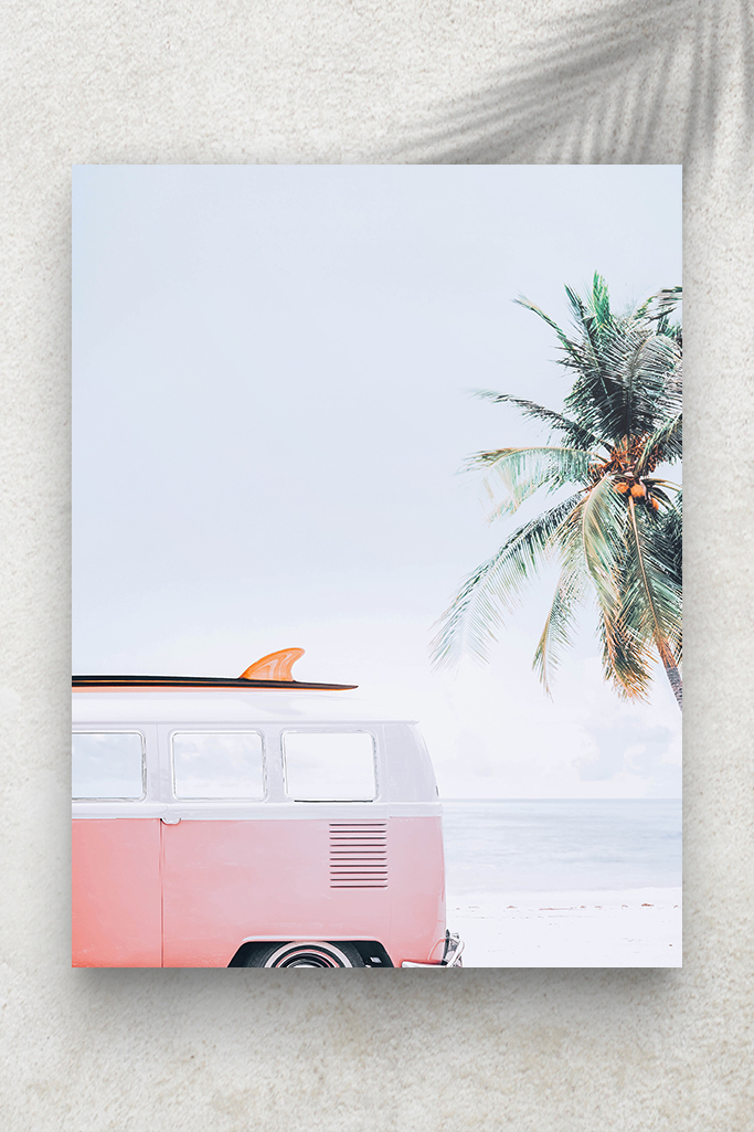 Affiche très tendance représentant un van rose avec sa planche de surf sur le toit, le tout sur un fond de palmiers de Californie avec un effet vintage.